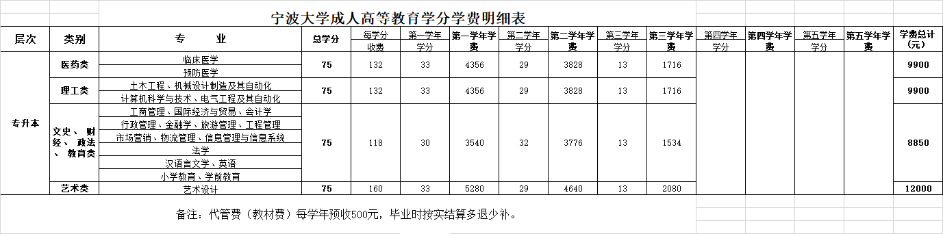 专升本75学分,最短学习年限2.5年,最长学习年限5年;学分学费标准:艺术类每学分160元;理工类、医学类、农学类每学分132元;文史类、经济管理类、法学类、教育学类每学分118元。