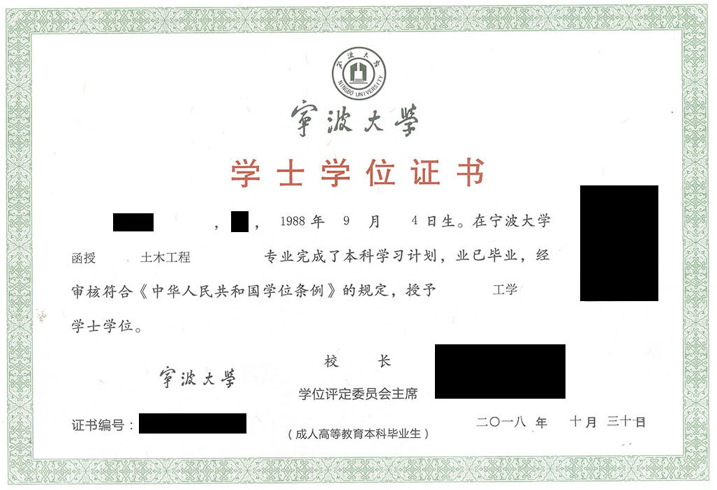宁波大学成人高等学历教育毕业证书及学位证书样张